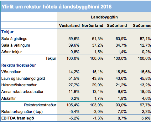 Rekstrarhagnaður (EBITDA) hótela á landsbyggðinni var almennt lakari en í Reykjavík á árinu 2018. Rekstrarafkoma var að meðaltali neikvæð á Vesturlandi og Norðurlandi en jákvæð á Suðurlandi og Suðurnesjum. Rekstrarhagnaður fyrirtækja á Suðurnesjum lækkaði úr 11,3% í 6,9% milli áranna 2017 og 2018.